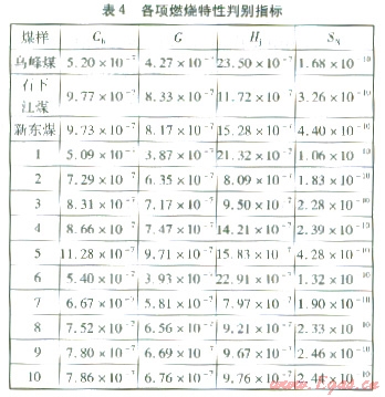 可燃性指數(shù)Cb主要反映煤樣燃燒前期的反應(yīng)能力,該值越大,表明可燃性越好。各煤樣的可燃性指數(shù)Cb見表4。由表4可知,單煤樣中,石下江煤、新東煤的可燃性較好,烏峰煤的可燃性較差?;烀旱目扇夹曰窘橛趦煞N單煤的可燃性之間,且隨著某種單煤比例的增加,混煤的可燃性指數(shù)Cb逐漸向該煤種靠近。烏峰煤與石下江煤按2:8摻混時,混煤的可燃性明顯變好。