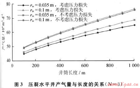 圖3為不同井筒半徑下,產(chǎn)氣量隨井筒長度的變化關(guān)系??梢钥闯觯壕查L度相同時,井筒半徑越小,對產(chǎn)能的影響也越大,影響的幅度也越明顯;當井筒半徑大到一定的值后,井筒內(nèi)壓力損失所造成的產(chǎn)量降低將不再明顯。在相同井筒半徑和裂縫條數(shù)下,壓裂水平井的產(chǎn)量不與水平段的長度成正比,當水平段長度達到一定的值后,產(chǎn)量的增加將變得緩慢。