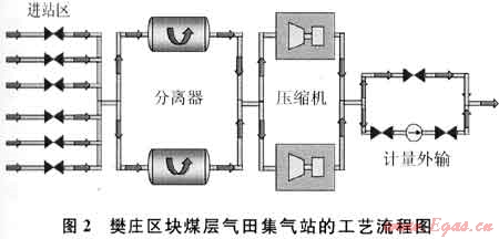 所有樊莊區(qū)塊煤層氣通過采氣管網(wǎng)收集到集氣站,再由集氣站增壓輸送到天然氣中央處理廠,經(jīng)集中凈化處理后輸送到“西氣東輸”主干道。煤層氣集中處理,提高了處理系統(tǒng)的規(guī)模效果;煤層氣規(guī)?;廨?,有利于資源統(tǒng)一調(diào)配,充分利用好煤層氣資源[8]。