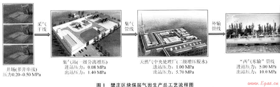 根據(jù)國家大力發(fā)展新能源的戰(zhàn)略要求,“十一五”期間中國石油天然氣股份有限公司在山西沁水盆地樊莊區(qū)塊開始規(guī)模開發(fā)煤層氣田,該區(qū)域位于山西省東南部、太行山西麓沁水盆地南部,行政隸屬于山西省晉城市沁水縣。樊莊區(qū)塊煤層氣田產(chǎn)能建設(shè)目標(biāo)為6.0×108m3/a,地面系統(tǒng)共建采氣井400余口、集氣站6個(gè),天然氣中央處理廠一期建設(shè)規(guī)模為10×108m3/a。2009年9月15日,天然氣中央處理廠產(chǎn)品氣開始源源不斷地輸送至“西氣東輸”管網(wǎng),樊莊區(qū)塊煤層氣田6.0×108m3/a產(chǎn)能建設(shè)完成,我國第一個(gè)規(guī)模化開發(fā)、商業(yè)化運(yùn)營的煤層氣示范工程進(jìn)入試生產(chǎn)階段。圖1為樊莊區(qū)塊煤層氣田生產(chǎn)總工藝流程圖。