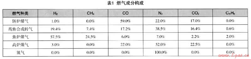 各種煤氣及氮?dú)獾某煞忠姳?,其中高焦合成轉(zhuǎn)氣是高爐煤氣和焦?fàn)t煤氣以一定比例合成,合成后的煤氣熱值與轉(zhuǎn)爐煤氣的熱值保持相等。從表1中可以看出,轉(zhuǎn)爐煤氣的主要可燃成分是一氧化碳,而高焦合成轉(zhuǎn)氣的主要可燃成分為氫氣、甲烷和一氧化碳,不可燃成分中,二氧化碳的比例基本相當(dāng),高焦合成轉(zhuǎn)氣中氮?dú)獾谋壤黠@大于轉(zhuǎn)爐煤氣。而當(dāng)使用氮?dú)馓娲郀t煤氣與焦?fàn)t煤氣合成轉(zhuǎn)氣后,合成轉(zhuǎn)氣中氮?dú)獾谋壤龑⒏摺?/span>