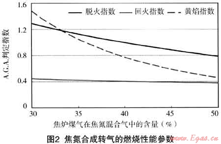 根據(jù)美國(guó)燃?xì)鈪f(xié)會(huì)A.G.A.36#公告中公布的關(guān)于燃?xì)饣Q性預(yù)測(cè)的方法[2~4],利用“I”指數(shù)法,對(duì)焦氮混合氣替代高焦合成轉(zhuǎn)氣時(shí)的脫火指數(shù)、回火指數(shù)和黃焰指數(shù)進(jìn)行了計(jì)算,其結(jié)果如圖2所示。