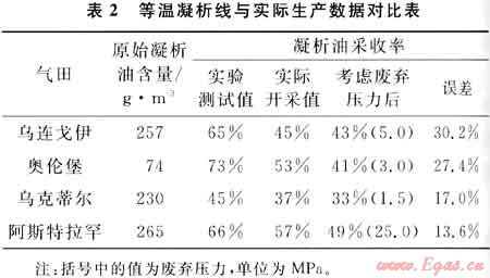 俄羅斯的烏連戈伊、奧倫堡、烏克蒂爾、阿斯特拉罕等凝析氣田比較的結(jié)果值得重視,飽和的油環(huán)凝析氣藏差別很大,不飽和的差別要小些,分析原因有[4]:①測等溫凝析線時放棄速度過快會造成油氣相態(tài)不平衡,從而帶來測試誤差;②多孔介質(zhì)的存在使采出凝析油量減少;③地層水(含凝析水)對相態(tài)的影響,一般影響較??;④凝析氣層中剩余原油飽和度的影響,一般影響較大。其對比結(jié)果見表2。